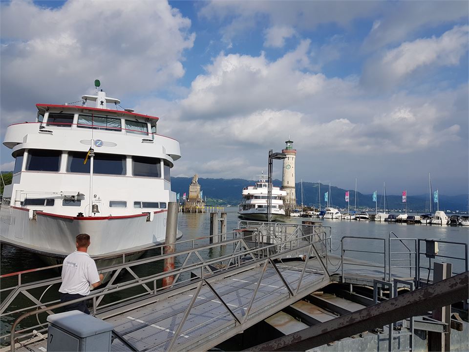 Gut gestärkt kann es nun wieder zurück an das Ufer des Bodensees gehen. Von Romanshorn fahren Sie in ca. 40 Minuten mit der Autofähre einmal quer über den See bis Friedrichshafen – und das an seiner breitesten Stelle von 14 Kilometern und über eine Tiefe von 252 Metern.