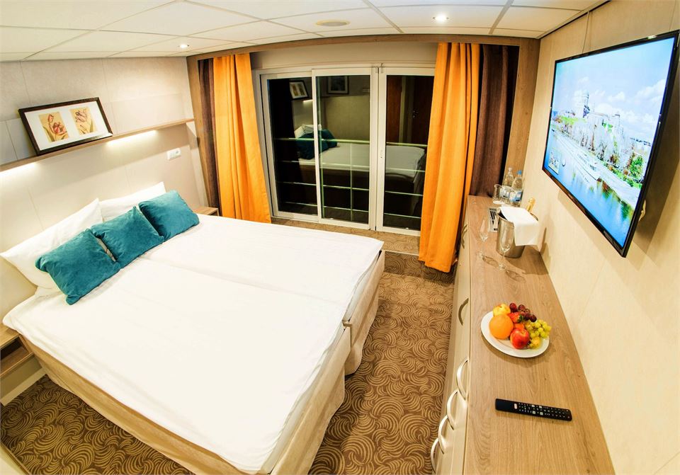 Alle Kabinen liegen außen, sind komfortabel und elegant eingerichtet, mit französischem Balkon. Die Betten lassen sich wahlweise als Doppel- oder Einzelbetten stellen. Ausstattung: Dusche/WC, Fön, individuell regulierbare Klimaanlage, Radio, SAT-TV, Telefon, Safe, Stromspannung 230V Wechselstrom. Kabinengröße ca. 14 qm