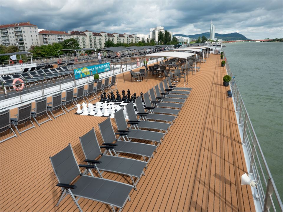 Großflächiges Sonnendeck mit Liegestühlen, Sitzgruppen und Schattenplätzen, Fitnessbereich. WLAN (kostenpflichtig).